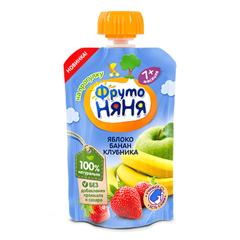 Trái cây nghiền vị táo, chuối và dâu tây Fruto Nyanya (90g) sử dụng 100% trái cây tự nhiên, không chứa chất phụ gia, chất bảo quản, tạo màu và GMO. Sản phẩm không có vị ngọt của đường, chỉ có hoa quả ngọt nguyên chất, cung cấp đầy đủ vitamin & khoáng chất cho bé.