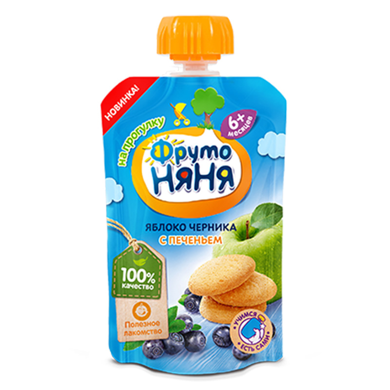 Thành phần: Táo nghiền, quả việt quất đen nghiền, nước, bánh quy (bột mì, đường, bơ, trứng gà, chiết xuất mạch nha, sữa bột nguyên chất, bột ngô, chất tạo xốp (Amoni carbonat INS503(i), Natri carbonat INS500(i))), hương liệu bánh quy tự nhiên.