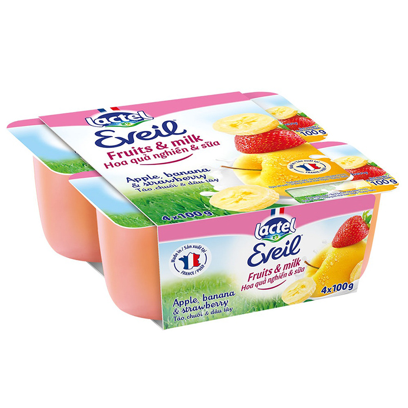 - Trái cây tươi nghiền sữa Lactel Eveil táo chuối dâu có vị ngon tuyệt hảo từ 85% trái cây tươi và 15% sữa chất lượng chuẩn Pháp.