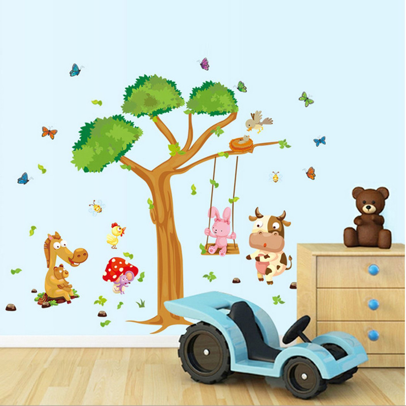 Tranh dán tường thú vui đùa M0095 được làm từ giấy cao cấp, bề mặt phủ lớp Vinyl, chống trầy xước, có thể bóc ra dễ dàng mà không để lại vết trên tường. Hình ảnh tranh ngộ nghĩnh: các loài thú như bò, ngựa, chim... đang cùng chơi xích đu vui vẻ bên cây xanh.