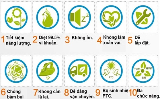 - Bộ sản phẩm: 1 vỏ tủ, 6 khớp nối bằng nhựa, 9 ống kim loại dài 68cm, 12 ống kim loại 64cm, 1 máy sấy có điều khiển.