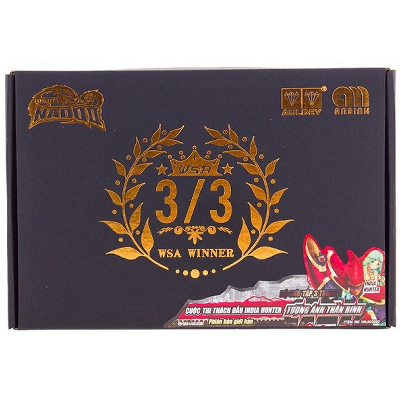 Vòng quay Tượng ảnh thần binh (3/3) - phiên bản giới hạn 903093có hộp trang trí hình ảnh vòng nguyệt quế cùng vương miện màu đồng thể hiện sự mạnh mẽ, chắc chắn. Con quay và lưỡi dao cũng được thiết kế đồng màu tạo sự đồng bộ cho sản phẩm, chắc chắn sẽ tạo được cảm giác thích thú cho trẻ.