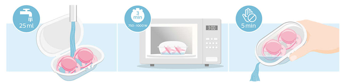 - Đặt ty ngậm đã rửa sạch vào hộp đựng, cho thêm 25ml nước và để trong lò vi sóng ở mức công suất 750-1000W trong 3 phút. Để nguội trong 5 phút, xả nước ra và ty ngậm đã sẵn sàng để sử dụng.