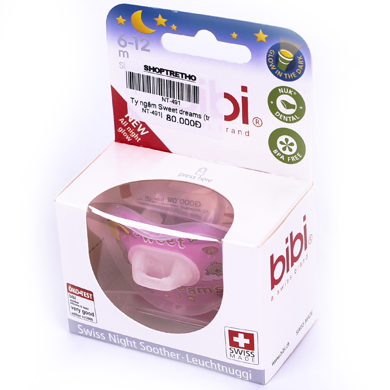 Đến từ thương hiệu cao cấp BiBi của Thụy Sĩ, ty ngậm Sweet Dreams được làm từ chất liệu Silicone mềm mại và an toàn nhất cho bé từ 6 tháng tuổi trở lên. Sản phẩm giúp thúc đẩy việc bé thở bằng mũi, hạn chế vi khuẩn xâm nhập với thiết kế ngộ nghĩnh, màu sắc tươi sáng kích thích thị giác bé pháy triển. Mẹ có thể bé ngậm cả ban ngày hoặc lúc đi ngủ mang lại cảm giác như đang ty mẹ cho bé.
