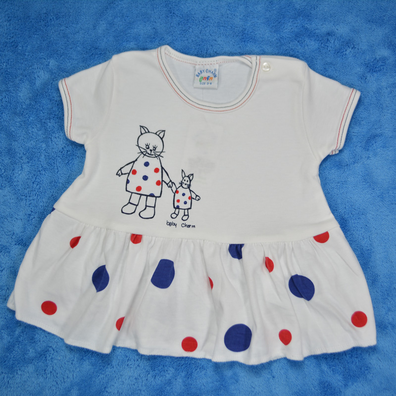 - Váy thiết kế dáng xòe với họa tiết chấm bi, in hình chú mèo ngộ nghĩnh