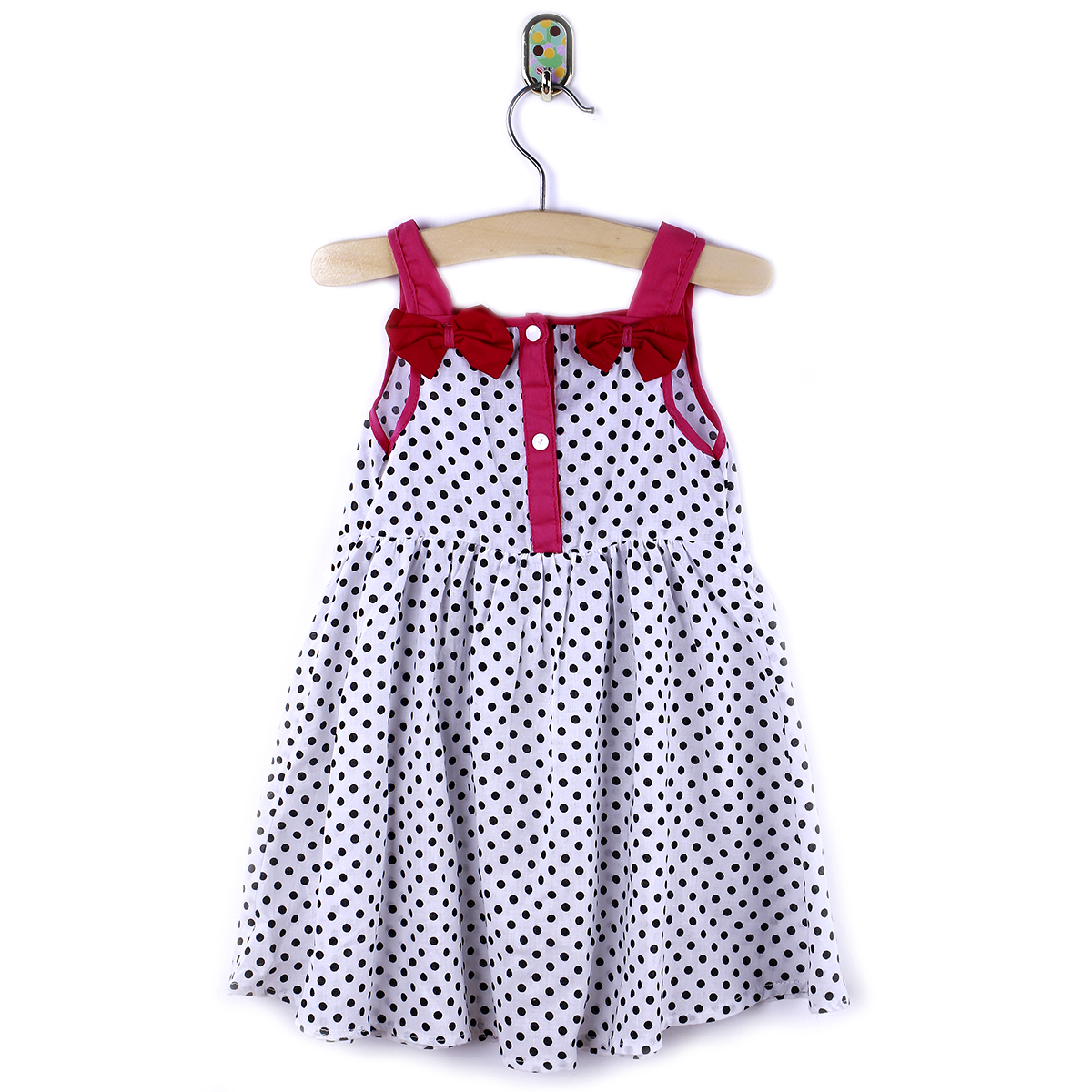 - Váy bé gái thô hai dây sát nách, chấm bi, đính nơ ngực trái.