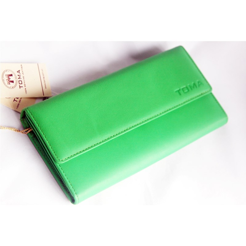 Bên ngoài da sần,khóa bấm cài nơ màu xanh lá cây,in chữ Toma dọc mép ví,may viền chỉ xung quanh