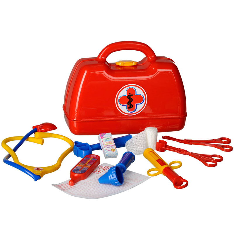 Đồ chơi bác sĩ dụng cụ bác sĩ như kim tiêm, kéo, sổ tay ghi chú, bông gòn… đặt trong một vali màu đỏ bằng nhựa. Qua đó, bé có cơ hội khám phá nhiều điều thú vị và mới lạ của cuộc sống xung quanh như: bác sĩ khám bệnh thế nào, bác sĩ dùng dụng cụ gì... Đồng thời, bé còn có cơ hội học hỏi nhiều kiến thức bổ ích.
