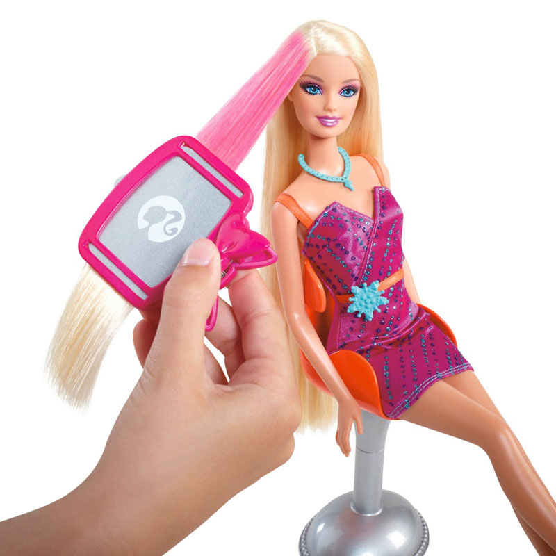 Màu hồng, tím, hay cam, bé có thể nhuộm màu tóc cho Barbie tùy thích theo ý bé.