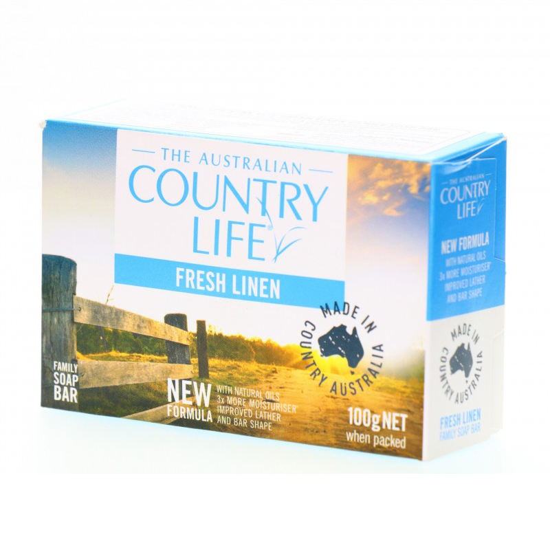 Xà bông Country Life Fresh Linen 100g (hộp) chứa chiết xuất dầu dừa, giúp làm sạch hiệu quả, dưỡng ẩm cao với hương thơm như nắng sớm bình minh. Sản phẩm được sản xuất tại Úc nên bố mẹ yên tâm về nơi sản xuất cũng như chất lượng sản phẩm nhé.
