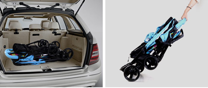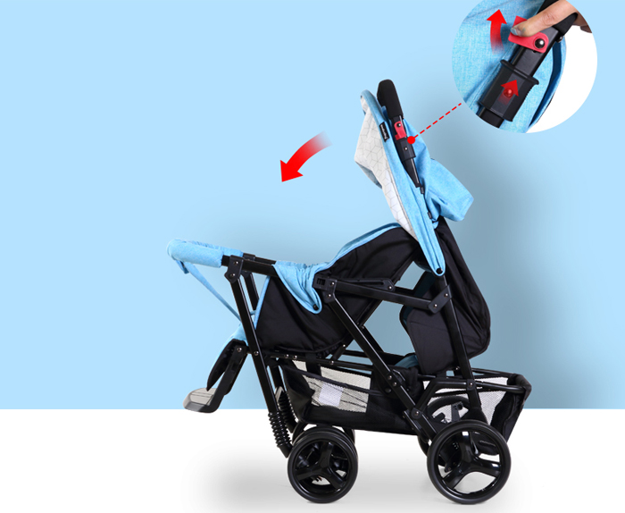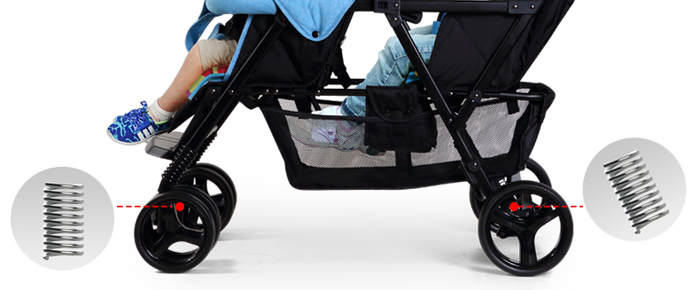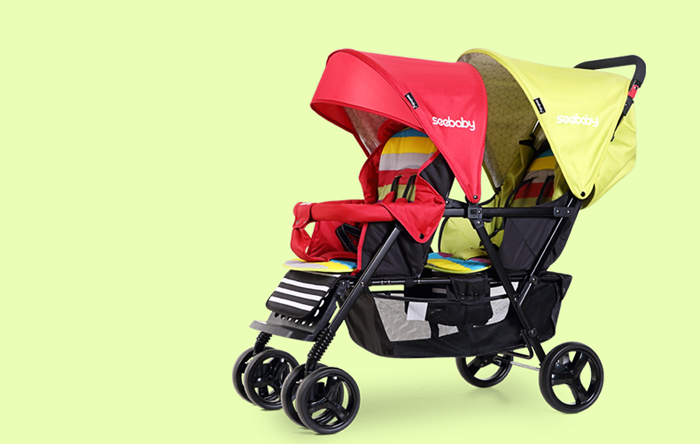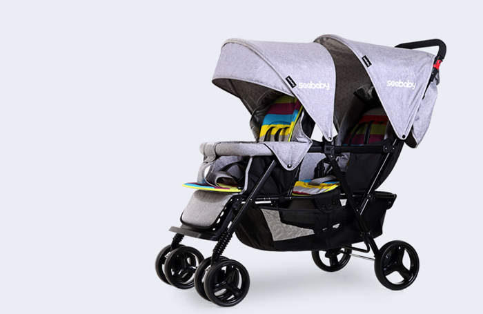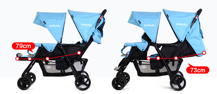 Xe đẩy đôi Seebaby T33 với thiết kế 2 ghế ngồi trước sau, giúp xe gọn nhẹ, không cồng kềnh như các dòng đẩy đôi mà ghế ngồi song song, nên mẹ có thể dễ dàng di chuyển khi đi thang máy, thang trượt, qua cổng soát vé. Khung xe bằng kim loại chắc chắn với bánh xe to, đệm nằm êm ái, mang đến cảm giác thoải mái cho bé khi ngồi xe đẩy.