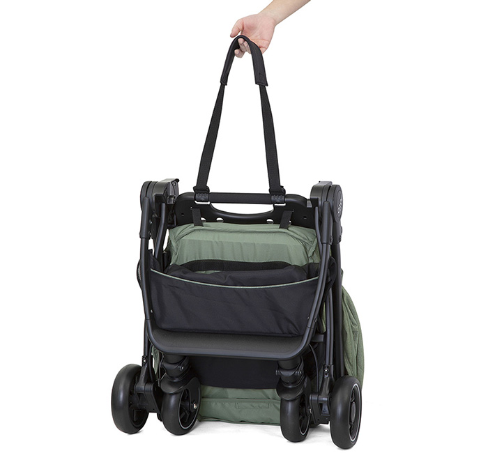 - Sau khi gấp gọn xe đẩy, mẹ có thể dùng dây đeo và túi xách đi kèm để mang theo sản phẩm.
