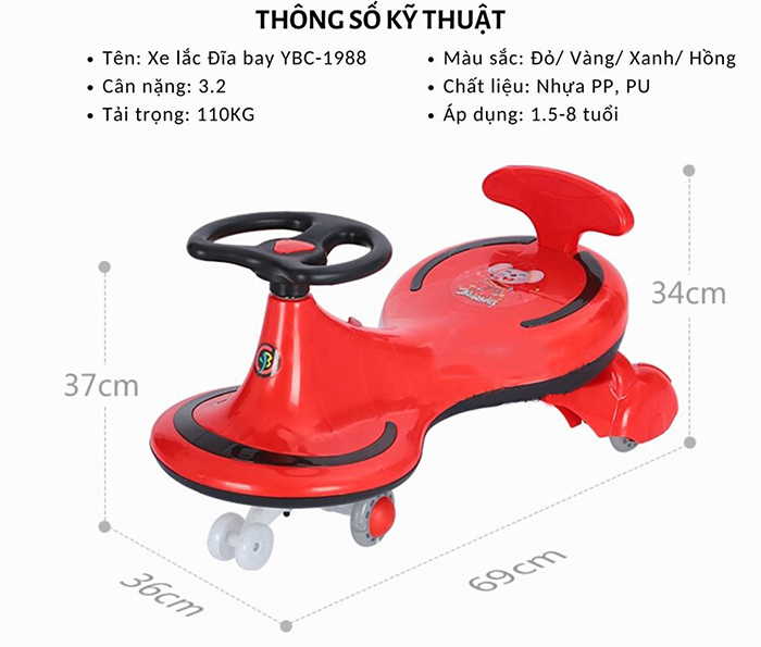 Xe lắc đĩa bay có đèn nhạc YBC-1988 (nhiều màu) với thiết kế bằng khung nhựa chắc chắn, chịu được tải trọng lên tới 30kg nên đảm bảo cho bé khi ngồi lên. Hơn nữa, xe dùng lực chân của bé để di chuyển nên trẻ có thể điều khiển tốc độ xe theo ý mình, phù hợp cho trẻ khi mới bắt đầu đi xe.