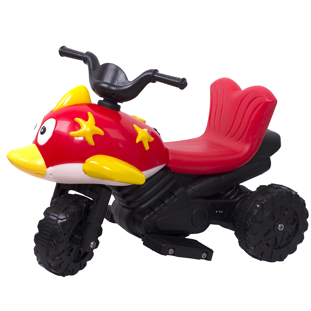 Xe máy điện trẻ em hình cá heo với thiết kế 95% là nhựa với các chi tiết rời hình hộp, khối khoa học, nhẹ nhàng và chắc chắn, các góc, cạnh của xe nhẵn và các góc tù giúp xe trở nên thân thiện và an toàn phù hợp làm quà tặng cho bé từ 2 tuổi trở lên. Đầu xe hình cá heo với màu sắc nổi bật, phù hợp với cả bé trai và bé gái.
