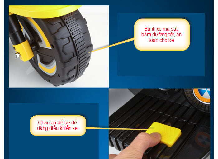 - Sử dụng rất đơn giản: Nút nhấn điện dạng bàn đạp sẽ giúp trẻ tự lái, có cả tích hợp đèn, nhạc.