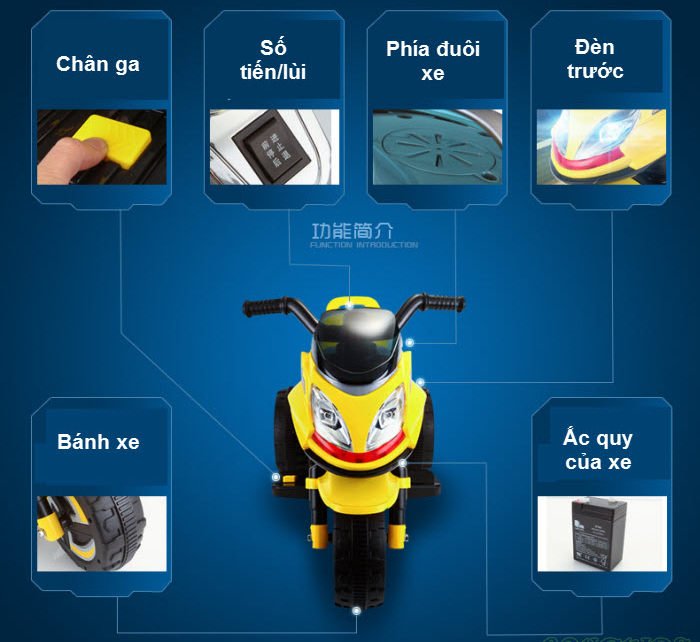 - Xe được thiết kế ba bánh giữ thăng bằng không lo bé ngã, có nhạc, còi đầy đủ.